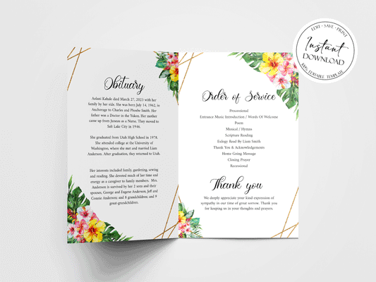 11x17 Celebration of life Tropical Hawaiian Plumeria Funeral Program Template H1
