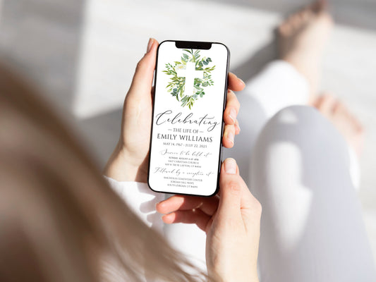 Celebration of life Watercolor Greenery Cross Digital Funeral Invitation Template G3