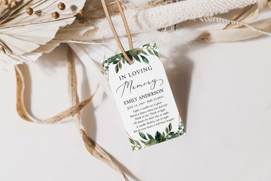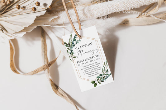 In Loving Memory Watercolor Greenery Gold Funeral Favor Tag Template Q1