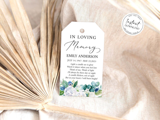 In Loving Memory White Blue Floral Funeral Favor Tag Template B1