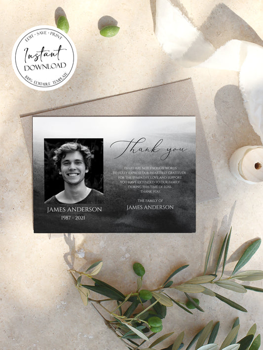 Celebration of life Black Watercolor Funeral Photo Thank You Card Template B6