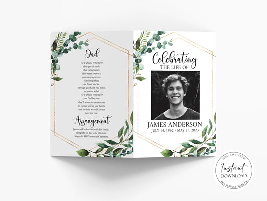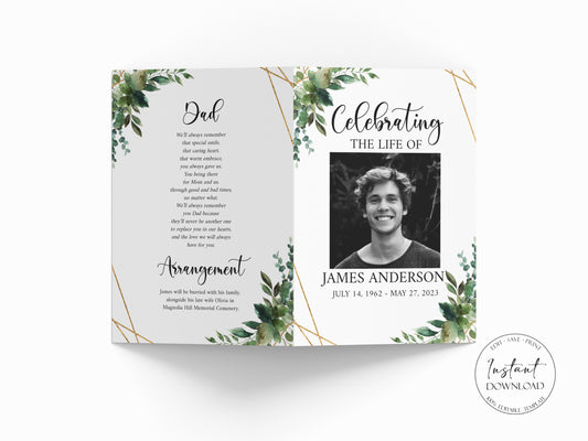 Celebration of Life 8 Page Watercolor Greenery Gold Funeral Program Template Q1