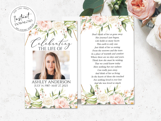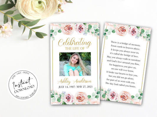 Celebration Of Life Blush Pink Roses Greenery Funeral Prayer Card Template F1