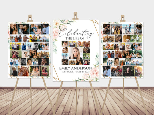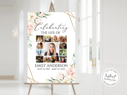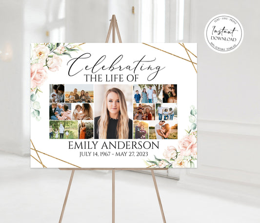 Celebration Of Life Blush Pink Roses Photo Collage Funeral Welcome Sign Template P4