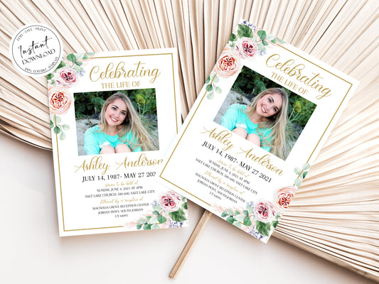Celebration of life Blush Pink Roses Greenery Funeral Program Template F1