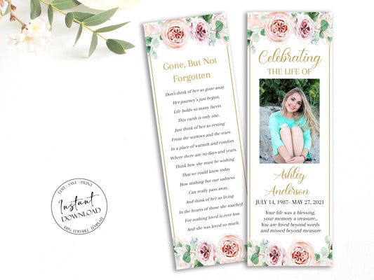 Celebration of Life Blush Pink Roses Greenery Funeral Bookmark Template F1