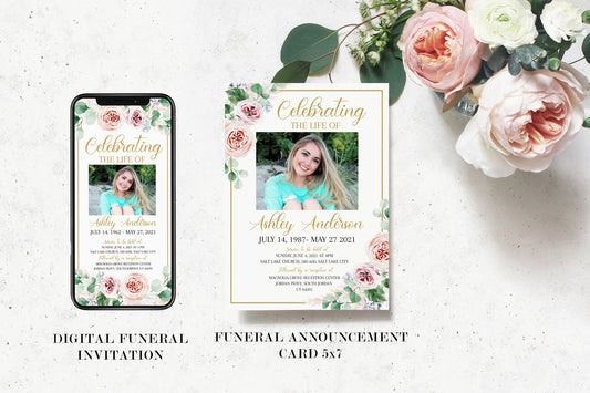 Celebration of life Blush Pink Roses Greenery Funeral Invitation Template F1