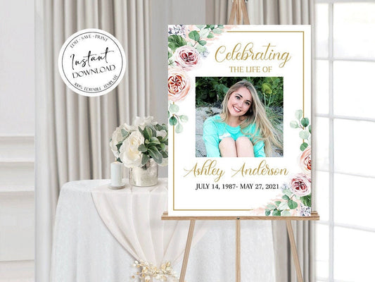Celebration Of Life Blush Pink Roses Greenery Funeral Welcome Sign Template F1
