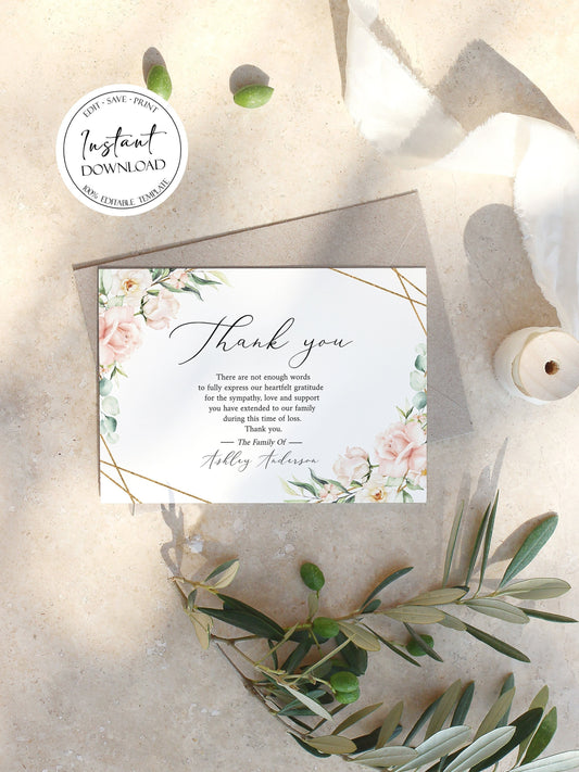 Celebration of life Blush Pink Roses Funeral Thank You Card Template P4