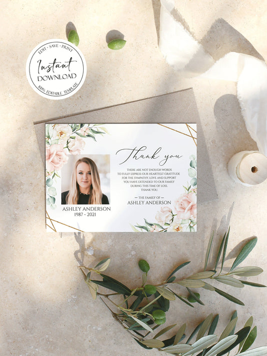 Celebration of life Blush Pink Roses Funeral Photo Thank You Card Template P4