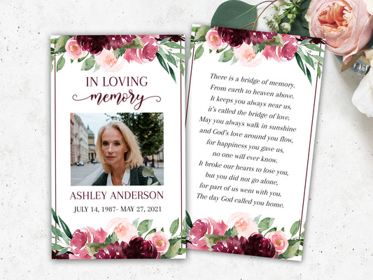 Celebration of life Burgundy Red Roses Funeral Prayer Card Template R2