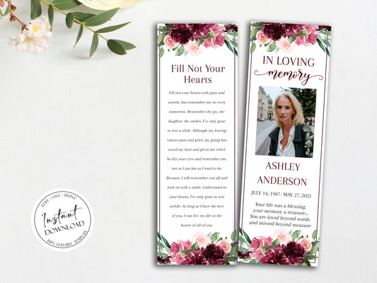 Celebration of Life Burgundy Red Roses Funeral Bookmark Template R2