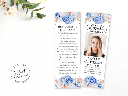 Celebration of Life Blush Roses White Blue Hydrangea Funeral Bookmark Template O1