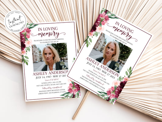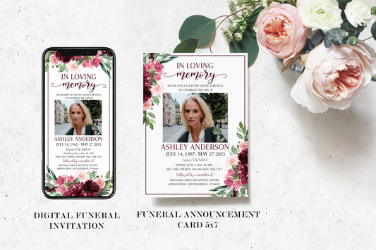 Celebration of life Burgundy Red Roses Digital Funeral Invitation Template R2