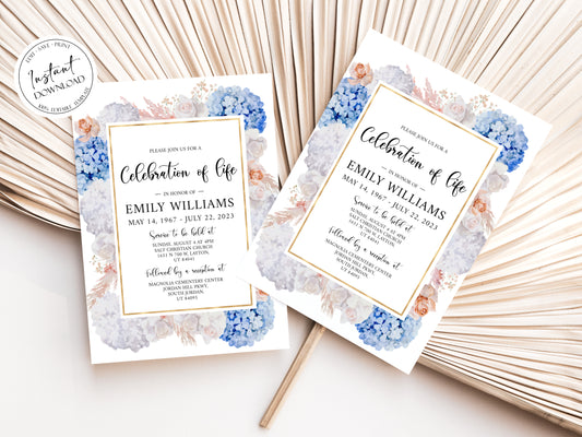 Celebration of life Blush Roses White Blue Hydrangea Funeral Invitation Template O1