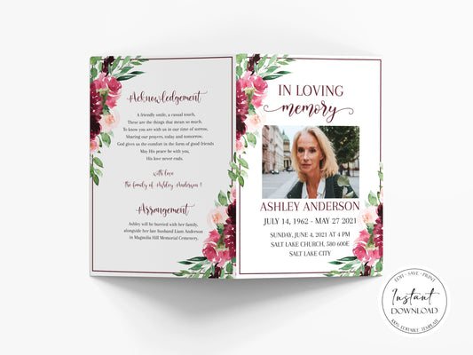 Celebration of life Burgundy Red Roses Funeral Program Template R2