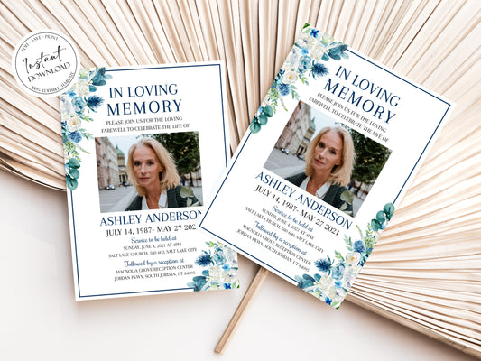 In Loving Memory Blue White Floral Digital Funeral Invitation Template B1