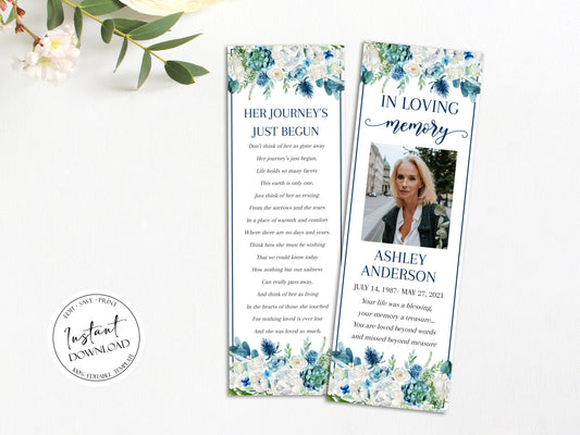 In Loving Memory Blue White Floral Funeral Bookmark Template B1