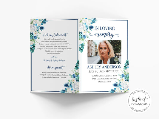 In Loving Memory Blue White Floral Funeral Program Template B1
