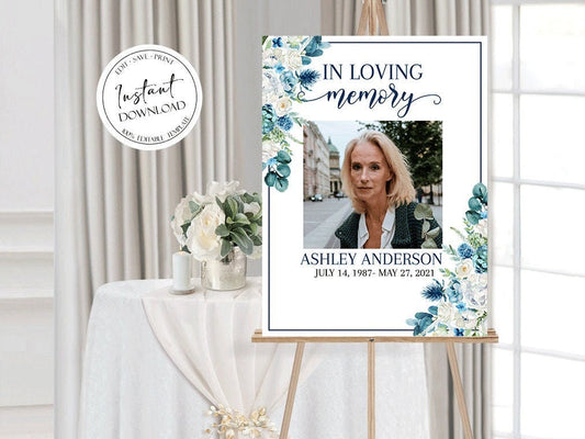 In Loving Memory Blue White Floral Funeral Welcome Sign Template B1