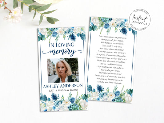 In Loving Memory Blue White Floral Funeral Prayer Card Template B1