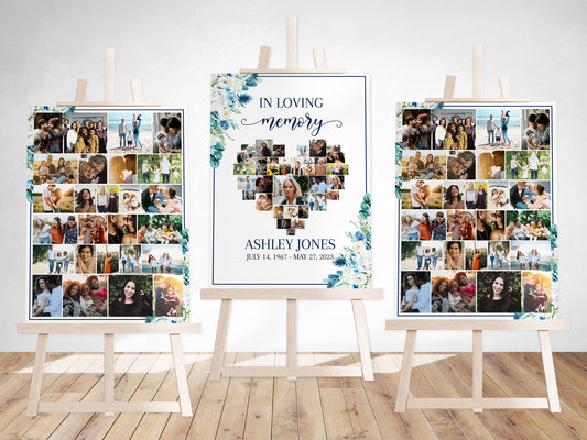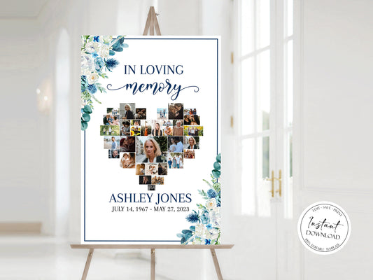 In Loving Memory Blue White Floral Heart Photo Collage Funeral Welcome Sign Templates B1