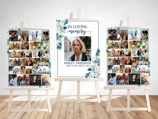 In Loving Memory Blue White Floral Photo Collage Funeral Welcome Sign Template B1