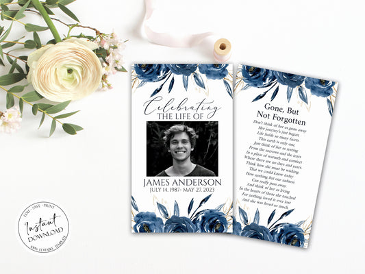 Celebration of life Royal Blue Flowers Gold Funeral Prayer Card Template B2