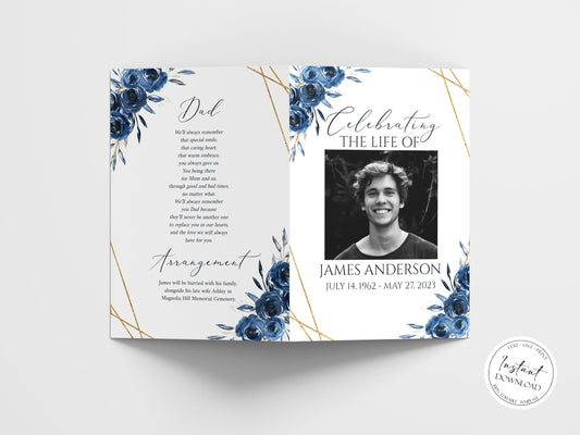 Celebration Of Life Royal Blue Flowers Gold Funeral Program Template B2