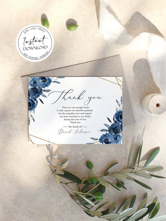Celebration Of Life Royal Blue Flowers Gold Funeral Thank You Card Template B2