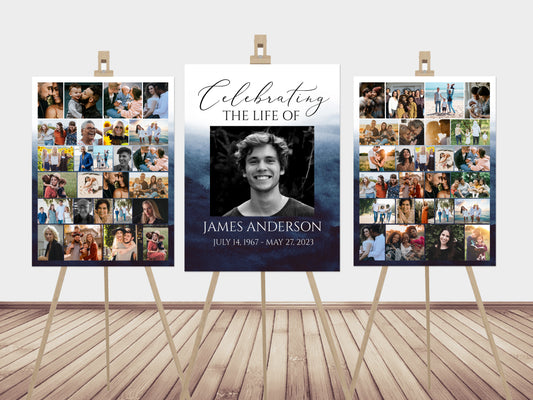 Celebration Of Life Blue Watercolor Ocean Photo Collage Funeral Welcome Sign Set B5