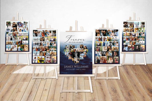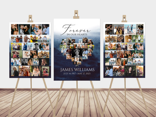 Blue Watercolor Ocean Heart Photo Collage Funeral Welcome Sign Set Forever in our Hearts B5