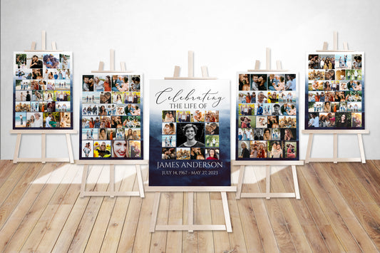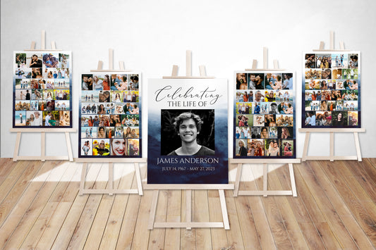 Celebration Of Life Blue Ocean Watercolor 5 Photo Collage Funeral Welcome Sign Set Template B5