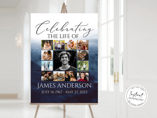 Celebration Of Life Blue Watercolor Ocean Photo Collage Funeral Welcome Sign Template B5