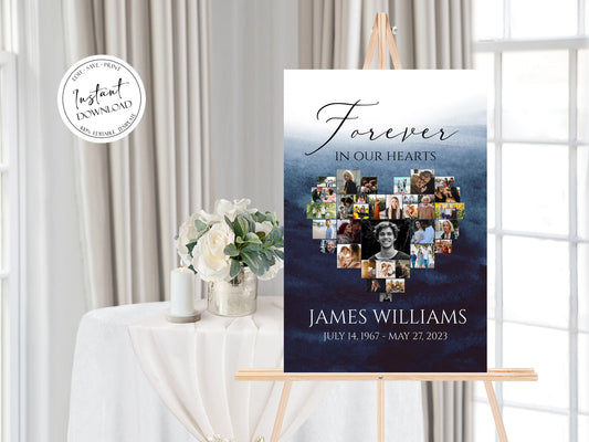 Blue Watercolor Ocean Heart Photo Collage Funeral Welcome Sign Forever in our Hearts B5