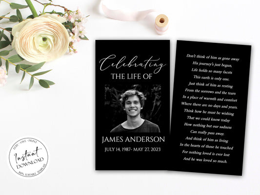 Celebration of Life Minimalist Elegant Black Funeral Prayer Card Template B7