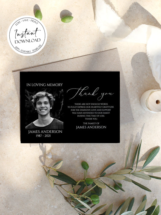 Celebration of life Minimalist Elegant Black Photo Funeral Thank you Card Template B7
