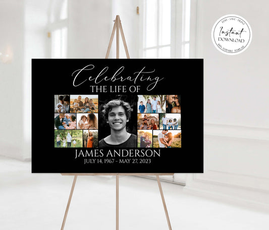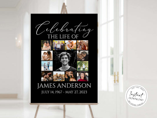 Celebration Of Life Minimalist Elegant Black Photo Collage Funeral Welcome Sign Template B7
