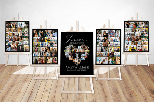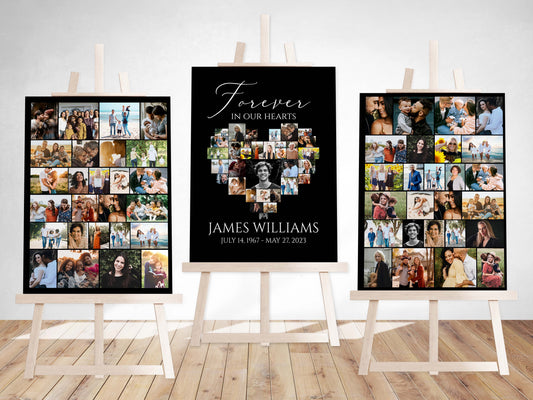 Forever in our Hearts Minimalist Elegant Black Heart Photo Collage Funeral Welcome Sign Set Templates B7