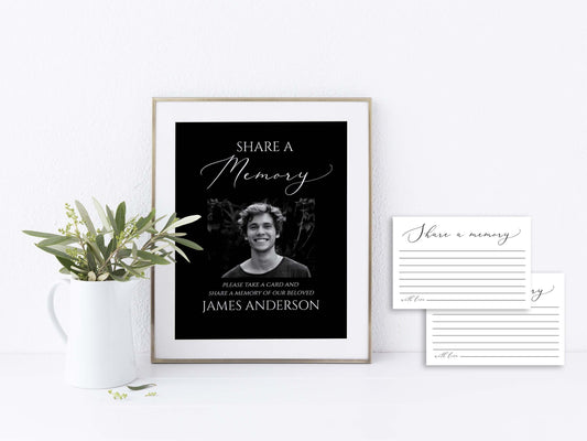 Minimalist Elegant Black Share a Memory Funeral Sign and Share a Memory Card Template B7