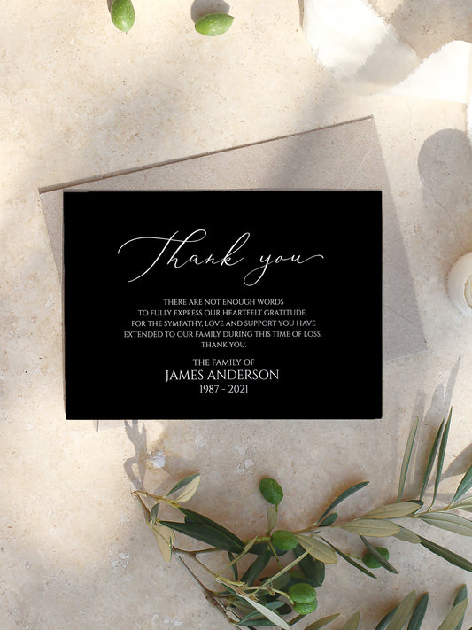 Celebration of life Minimalist Elegant Black Funeral Thank you Card Template B7