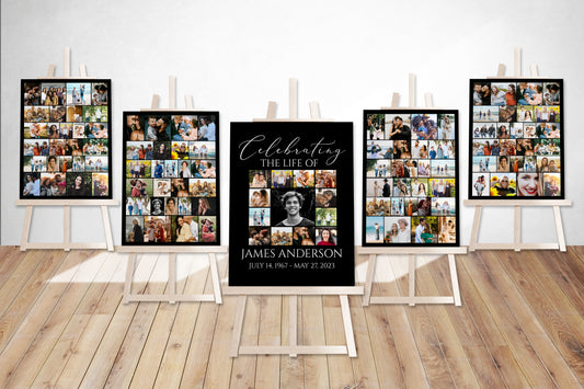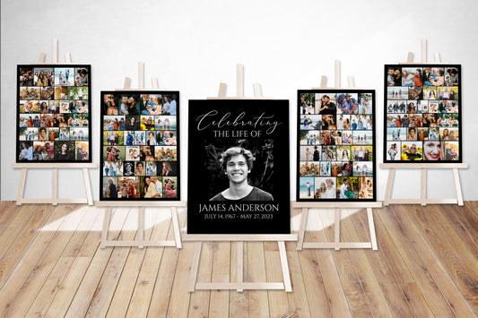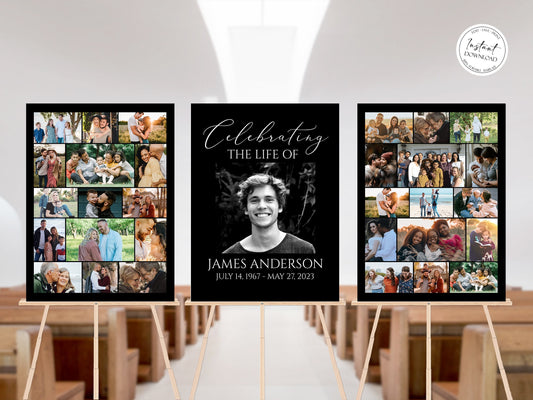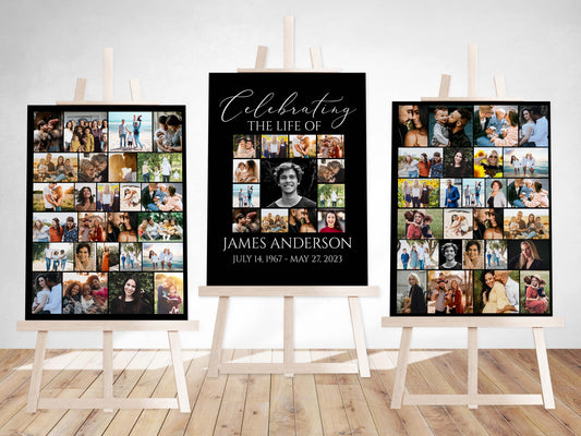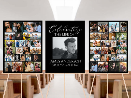 Celebration Of Life Minimalist Elegant Black Photo Collage Funeral Welcome Sign Set Templates B7