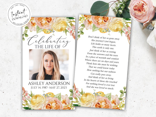 Celebration Of Life Elegant Yellow Pink Floral Funeral Prayer Card Template E1