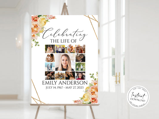Celebration Of Life Elegant Yellow Pink Floral Photo Collage Funeral Welcome Sign Template E1