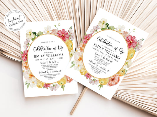 Celebration of life Elegant Yellow Pink Floral Funeral Invitation Template E1