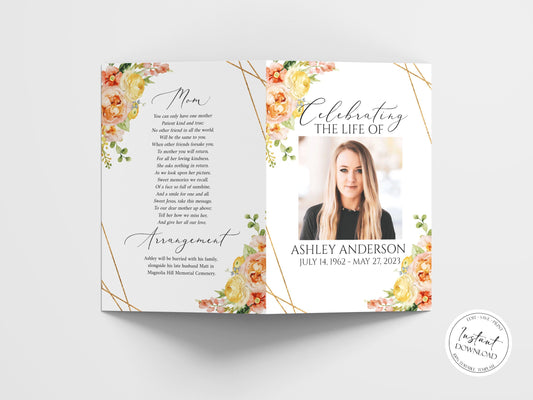 Celebration of life Elegant Yellow Pink Floral Funeral Program Template E1