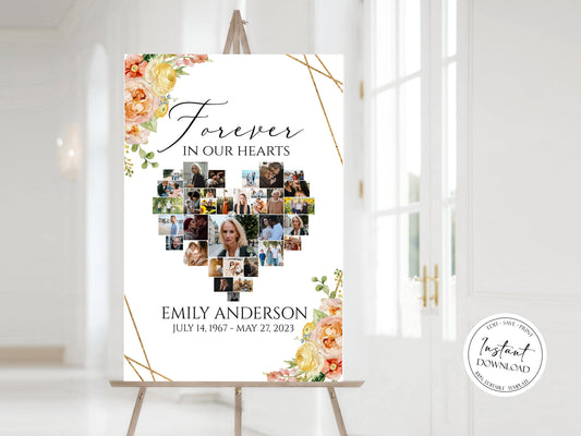 Forever in our Hearts Elegant Yellow Pink Floral Heart Photo Collage Funeral Welcome Sign Template E1