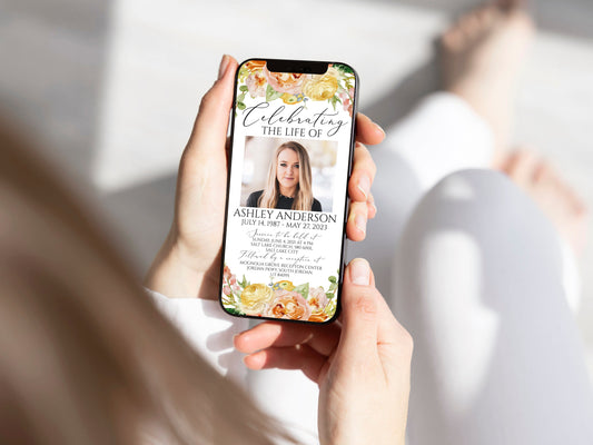 Celebration of life Elegant Yellow Pink Floral Digital Funeral Invitation Template E1
