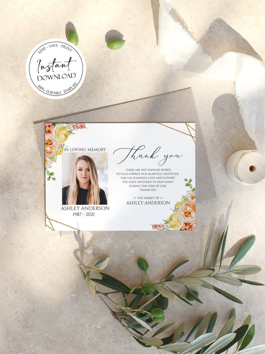 Celebration of life Elegant Yellow Pink Floral Funeral Photo Thank You Card Template E1