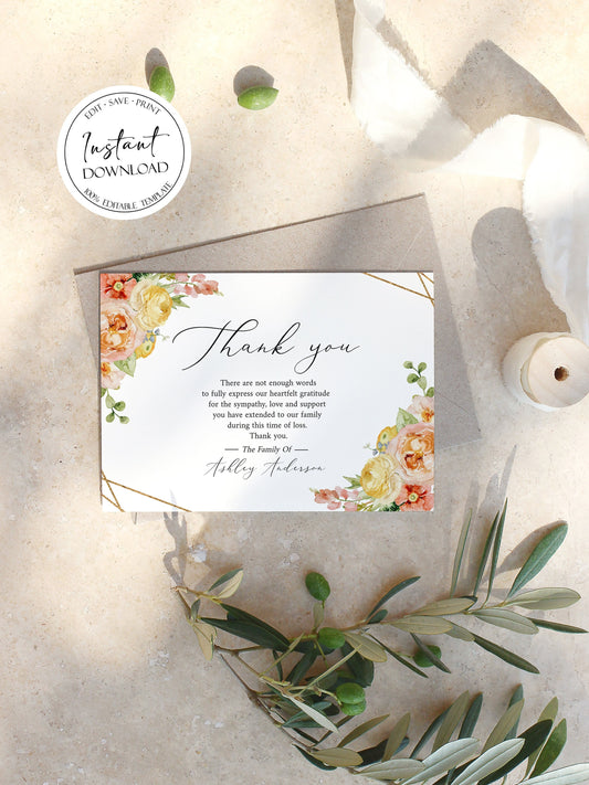 Celebration of life Elegant Yellow Pink Floral Funeral Thank You Card Template E1